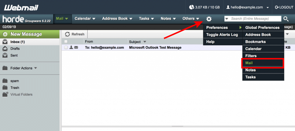 - Click the Cog icon in the menu and Select Preferences > Mail.